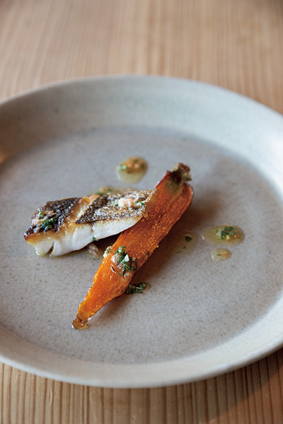 「黒田五寸人参、イサキ」。黒田五寸人参は、最初に西洋から長崎に入ってきたニンジンで岩崎が守り継いできたもの。イサキにクミンとパクチーのソースを添えて。