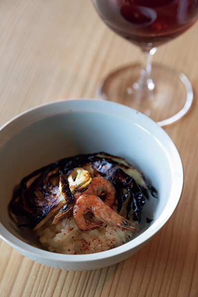 「千々石のお米、アラカブ」。雲仙ではアラカブと呼ばれるカサゴの出汁の雑炊。岩崎が育てたキャベツと芝エビの香ばしさに、ペアリングの軽やかなチェコ産赤ワイン「ポッドファック 2018」が相性抜群。