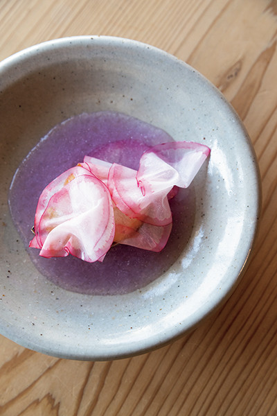 「源助大根、雲仙赤紫大根、五木赤大根」。雲仙赤紫大根はおろして優しい出汁に、スパイシーな五木赤大根はスライスして。3種の在来種大根によるハーモニーを楽しめる。