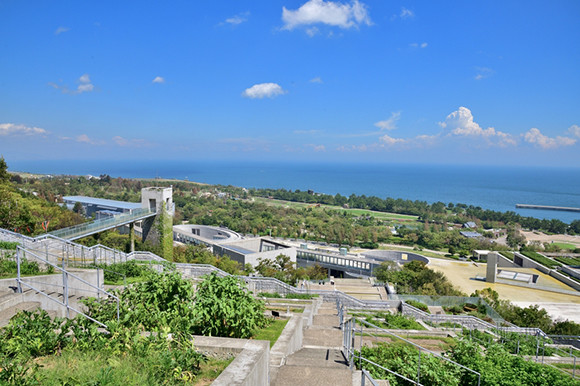 内部は巨大な集成材の柱や梁によって支えられ、天井高16mの空間に太くて長い柱がそびえ立つ姿が森の生命力を暗示。館内には世界の木造建築の模型などが展示され、アップダウンするスロープに沿って展示室を巡るようになっている。館内を見終わった後、建物を貫通する通路を突き進んでいくと展望台が現れる。そこで感じられるのは、季節によって移り変わる自然の営み。こんな安藤建築が人里離れた山奥にひっそりたたずんでいるのが実に興味深い。