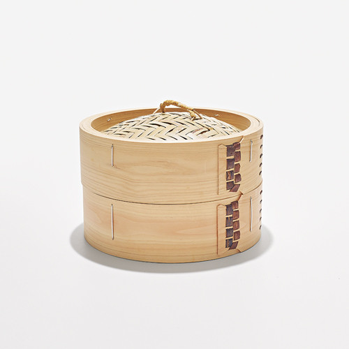 山下アキヒロによる中華せいろは、国産檜でフレームを組み、留め具にも国産山桜の樹皮を使う。厚みあるフレームは頑丈で、反り返りを防ぐ。サイズも幅広く展開し、修繕にも対応する。蒸すだけでなく、温め直す作業にも。美しい佇まいはそのまま食卓で楽しみたい。中華せいろ24cm(身φ24×H9.8cm、蓋φ24×H9.5cm)¥14,300/宙 SORA