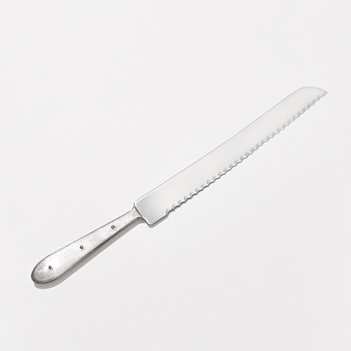 少し反った刀身がエレガントな印象の、金工作家の竹俣勇壱によるブレッドナイフ。柔らかいパンにも抵抗なく刃が入るように、刃は鏡面仕上げのステンレスを採用。ハンドル部分は真鍮製のリベットで留め、古色仕上げのクラシカルな雰囲気。こだわりのカッティングボードとともに食卓で楽しみたい。(刃渡り20×W30cm)¥12,100/フードフォーソート