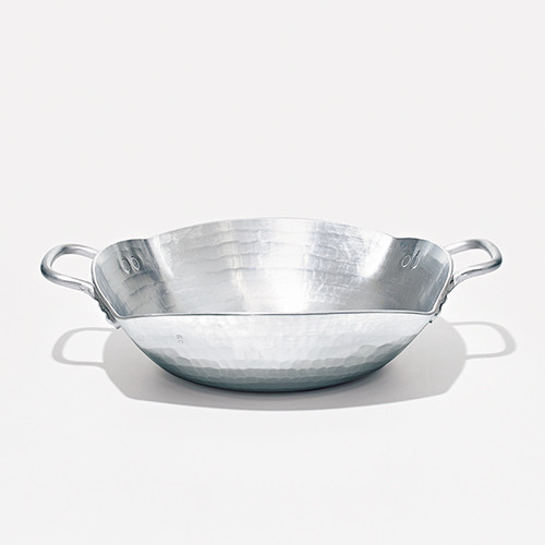 京都市内に工房を構えるウエストサイド33によるアルミ製鍋。熱伝導率が高いアルミは料理の温冷ともによくなじみ、軽くて丈夫。円と四角を組み合わせた独特の形状で鍋物は具が泳ぐことがなく、槌目が美しいモダンなデザインはサラダなどを盛るのにもよい。3サイズにて展開。27cm(W27×D21×H8cm)¥17,600/鍛金工房ウエストサイド33
