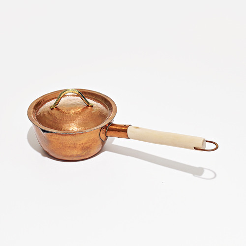 渓壽庵は、兵庫県神戸市の鍛金工房。銅の表情が美しい片手鍋は、一枚の銅板を金槌で叩き絞ることで立体的な形状を作り出した。柄に曲がりや節のある地肌のきめ細かい椿を使う。鍋の内側に錫を引き、外側は漆を拭きとった後にオーブンに入れて焼くことで漆を定着させる仕上げがされている。(φ16〜17cm)¥22,000/ジンナンハウス
