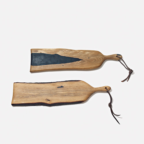 今田智幸が営む鹿児島県奄美大島の木工房、ウッドワークス キュウ。ガジュマルやサルスベリなど、台風前や畑の整備で伐採される島の木を使い、それぞれの特性や表情を生かした作品を生み出す。このカッティングボードは琉球黒檀を使っており、それぞれに独特な黒地が入る。(各W43×D11×H1.5cm)各¥23,650/ともにプレイマウンテン