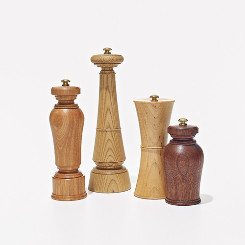 長野県大町市の木工房によるスパイスミルは、木工ろくろを使って彫刻的なフォルムを展開。樹種も幅広く、刃も複数揃うので、並べてキッチンを彩りたい。左から、トチ製ニンジン(H19cm)¥20,130、キハダ製タワー(H24cm)¥23,780、メープル製ツヅミ(H16cm)¥18,370、ブラックウォールナット製ツボ(H13cm)¥16,500/以上ギャラリー セン