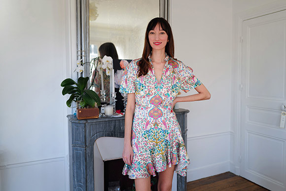 50年代からインスピレーションを得たレトロなデザインで人気のパリ発のミラレ。夏になると赤やオレンジなど元気な色を着たくなるというヴィクトリア。花柄ドレスにキャレルのストラップシューズでフェミニンにスタイリング。