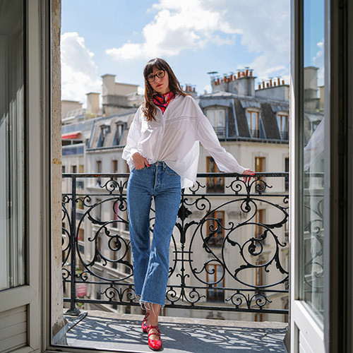 フランスの老舗フィガレのシャツは19世紀のバルザックのような雰囲気がお気に入り。ルージュのデニムにキャレルの赤いエナメルストラップシューズを合わせて。イヌイ・エディションのグラフィカル柄のスカーフでノスタルジックなアレンジ。