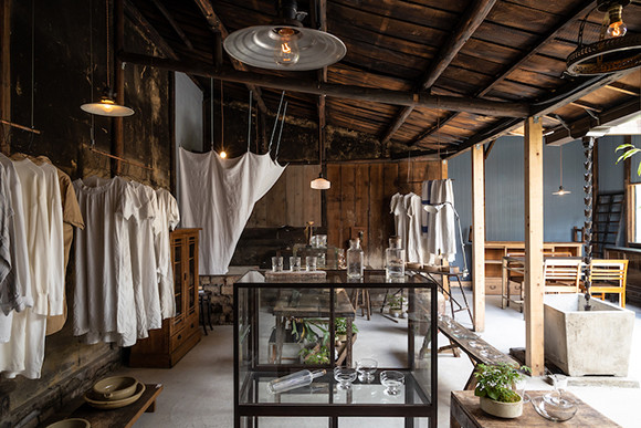 香川の青い羊の1920〜60年代ヴィンテージウェアや日本の古い石皿、江戸時代の薬瓶、陶芸家・前田美枝の器、新潟の照明作家、vickey’72のランプなど、生活を彩るさまざまなものが並ぶ。