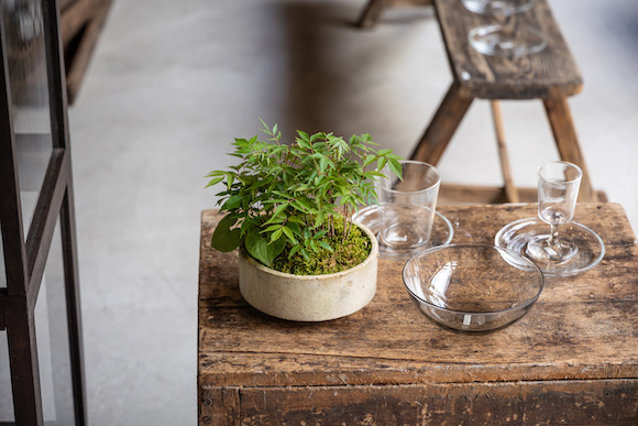 窯道具のサヤ鉢を多年草の鉢として再利用。多年草は滋賀の近江綴庭の平木雄一郎が担当。多年草の鉢植え¥5,800〜、ガラス製品は富山のWASHIZUKA GLASS STUDIOのもの。¥4,070〜