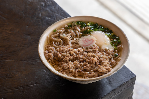 近所で人気店「炭火焼く鳥 ソリレス」を営む鈴木弘二さんの新展開。「東京の立ち食いそばを関西風の出汁でやりたいなと思って」。コロナ禍の3年間、出汁や麺の研究を続け、2021年12月31日にオープン。利尻昆布に本鰹や宗田鰹、潤目鰯、鯖の削り節で引いた出汁は、飲み干せるほどやさしく深い味わい。「限界まで細く、ゆるめに」という麺は小麦粉を2割混ぜた自家製麺の二八そば。大阪名物の肉吸いをイメージして、牛肉を薄くカットしてふわと仕上げた「名物!肉そば温泉卵」、お笑いユニットのネタを引用した「ムール貝酒蒸しにしてクレソン」など個性的なメニューが揃う。テーブル代わりは陶芸家・橋本知成の巨大オブジェ、丼は滋賀のNota&designに依頼した信楽焼、と実はアートな要素も楽しめる心にくい一軒だ。