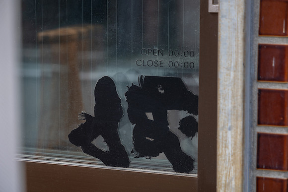 絵本に出てきそうな味わいのあるブルーのトタン小屋。場所は東山五条シティホールと東山シティホール専用駐車場の間の細い路地の奥。