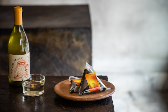 コンビニ風のおにぎりも人気。季節で変わる炊き込みご飯、玄米ちりめん山椒、玄米梅干しなど。自然派ワインは出汁との相性もよく、一緒に頼む人も多いそう。おにぎり¥300、グラスワイン白¥800