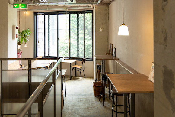 2階のカフェスペースで。河原町通を見下ろせる窓側が気持ちいい。