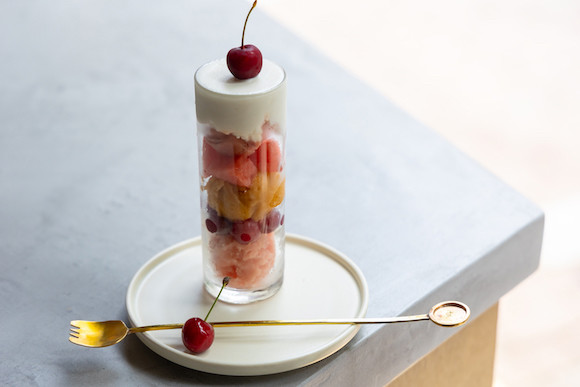 岐阜・棚橋牧場の牛乳、山形・深瀬農園の紅さやか、熊本・ローソンファームのスイカ、高知・中野農園のびわのジェラートを盛り込んだ「初夏のさくらんぼパフェ」¥2,100。※現在は佐藤錦や富良野メロン、よもぎの「佐藤錦のずるいパフェ」¥2,100を提供中。