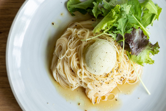 うどん店を営む岐阜の実家から取り寄せた麺つゆを使った素麺に、「れもん葉山椒」のジェラートを乗せた「ジェラート素麺」¥1,000。ジェラートは時々でスパイス系を使用。ジェラートが甘くないから、新感覚のおいしさ。冬にはおでんとジェラートの組み合わせも登場。