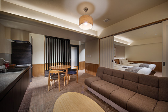 スイートルーム(60㎡)のリビングと寝室。ここでもF-CONはすっきりとしたルームインテリアのように見える。左壁際がキッチンで長期滞在にも一役買う。ソファー、机、ゴミ箱、靴ベラ、スツール、ハンガーはTEORI社製。竹の歯ブラシやコームブラシはSUS ORGANIC社製。歯磨きのペーストは食べても大丈夫な製品で研磨剤不使用など、細部までこだわりが。Photo: HOTEL GREAT MORNING