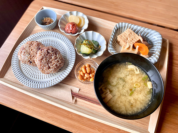 和朝食は古民家レストラン「天井桟敷」(https://www.tenjousajiki.com/)から。玄米炊き上げ後、3日~4日間発酵させ玄米おにぎり定食で朝の元気を。Photo: HOTEL GREAT MORNING