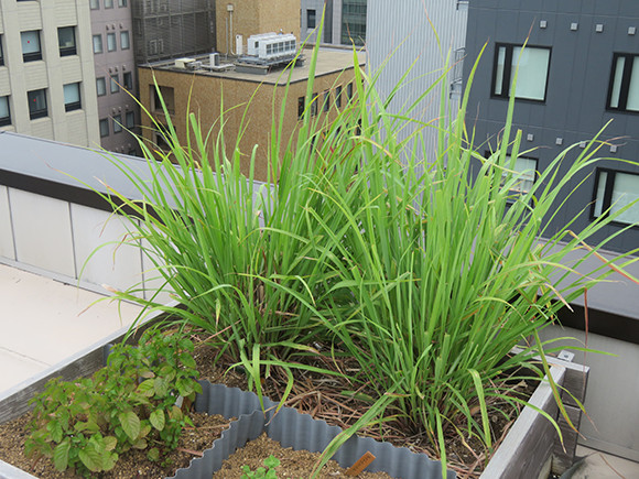 いままで使われていなかった屋上にハーブ類を収穫する屋上菜園を開始。写真は大きく育ったレモングラスとミントの葉。ウェルカムティーに利用。Photo: Kyoko Sekine