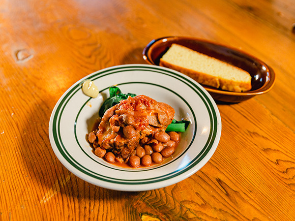 店を代表するメニューとしては、「コーンブレッド」や「野菜と豆のスープ」、「ローストチキン」などが挙げられる。中でも豚肉と豆を使ったトマト風味のアメリカの家庭料理「ポーク&ビーンズ」は、素朴な味わいでありながら食べ応えのある料理に仕上がっている。「家庭料理らしく身近にある食材を使っていることがポイント。豚は阿蘇の近くで育てた三元豚で、希少なブランド豚ではありませんが、とてもおいしい豚肉です。Tiger Manらしくアレンジを加えたものがお客様に喜んでもらえたらうれしいです」