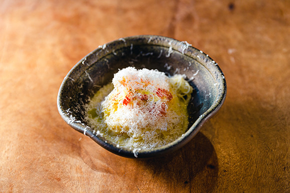 「SAZAE」、「IKURA」という海鮮の名を冠した店に続いてオープンした「UNI」。当初は炭焼き料理がメインの店だったが、牛深出身のオーナーシェフである梶原大吾さんが好きなものを次々とメニュー化。幅広い食を提供する飲食店へと変貌を遂げていった。「生産者の顔が見える食材にこだわって仕入れを続けていくと、いろいろな生産者との繋がりが生まれ、いまでは地の食材を使うことが多くなりました。ただし、お酒を飲みながら料理が楽しめる店というコンセプトは、オープン時から変わっていません」と、お酒をおいしく飲むための料理にこだわる。