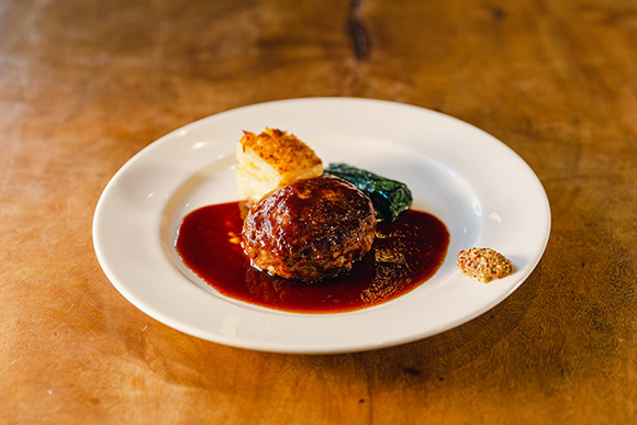 人気メニューは、「黒毛和牛ハンバーグ」。熊本の老舗、「ステーキ島崎」の島崎シェフから伝授されたもので、ナイフを入れると肉汁が溢れ出てくる。牛肉ならではの食べ応えを感じる一方で、タマネギの甘さが和風のソースが肉汁の旨味を引き立てる。