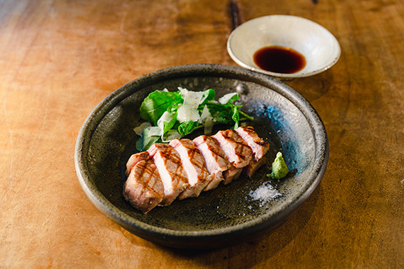 「なごみひのもと豚」は、火の本豚のロースを焼いたもので、あっさりした味わいと甘い脂が特徴。塩やわさび醤油で食べると、口の中に脂が広がり、豚肉本来のおいしさが堪能できる。