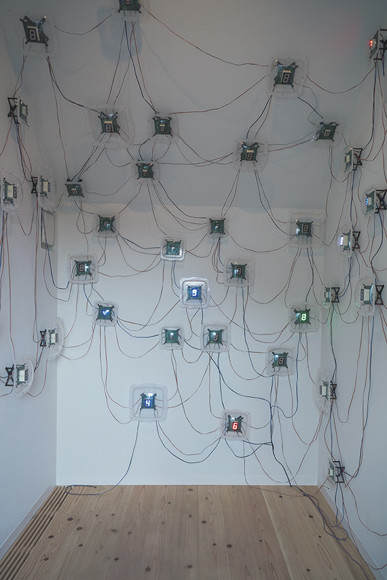 温かみのある杉材の床の空間の壁に張めぐされた宮島達男のネオン作品。