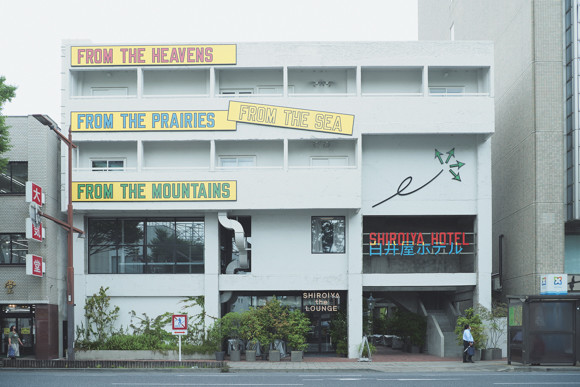 ローレンス・ウィナーのポップなタイポグラフィが目を引く外観。ホテルの清掃スタッフは、この作品をモチーフにした“つなぎ”を着用している。