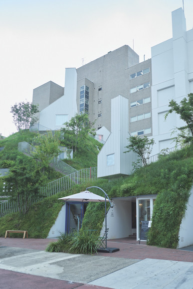 新設したグリーンタワーは、利根川の土手をイメージ。サウナルームが点在するほか、宮島達男の作品を展示した小屋もここにある。1階にはベーカリーやフルーツタルト専門店がある。