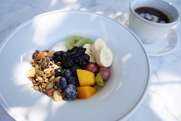 緑を感じるテラス席で自家製グラノーラの朝食