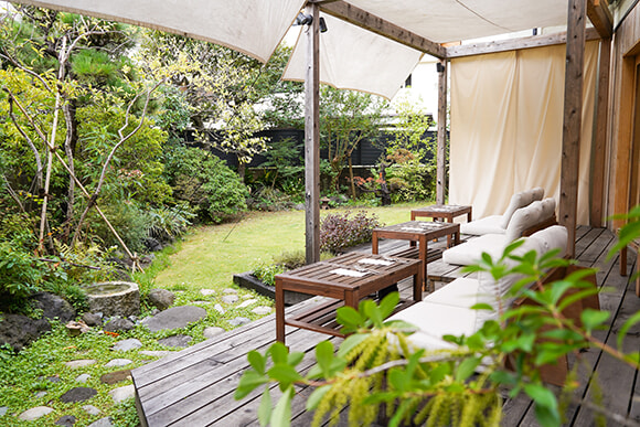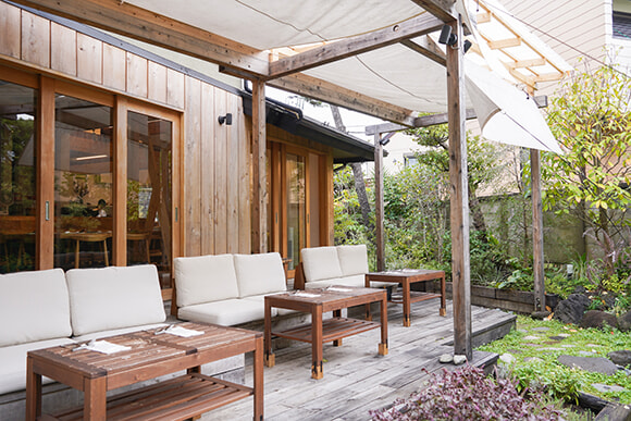 ソファーの置かれたテラス席は休日の朝を過ごすのにぴったり。