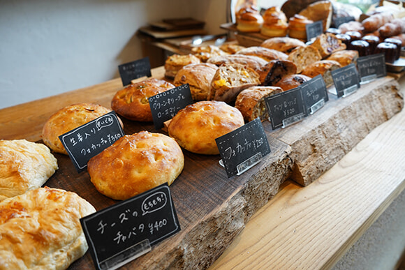 週末の朝、お散歩がてら訪れたくなるのが、庭のある一軒家のお店BREEZE BIRD CAFE & BAKERY。入り口入ってすぐのカウンターには、天然酵母を使った風味豊かなパンがずらりと並ぶ。