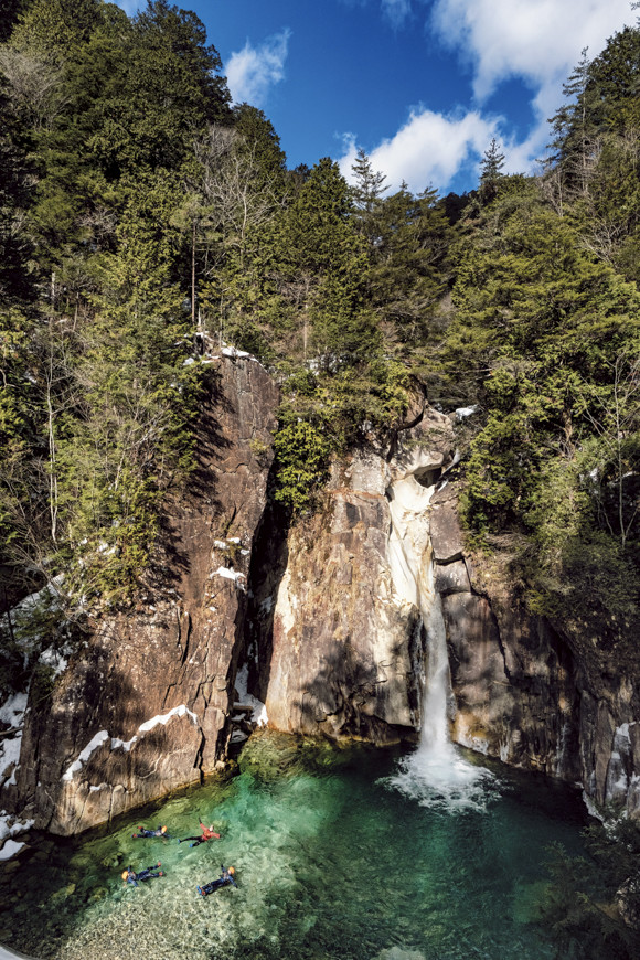 木曽川でのカヌーや中央アルプスを望むパラグライダー、中山道ハイキングなど、アクティビティを多数用意。安藤太郎や呉本圭樹などスペシャリストがガイドに。季節や天候に応じてアレンジ。1アクティビティが宿泊費に含まれる。滝や、花崗岩などから成る渓谷地帯を探検するシャ ワークライミングは、身体ひとつでダイナミックな自然を味わえる。