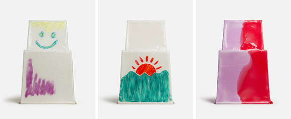 伝統的なトワルをベースにしたコットンの布地を着色したレジンに浸し、ところどころに手描きのドローイングをあしらった作りとなっているチェア「Come Stai?」。ショーに招待されたゲストが実際に座っていたように、実用性もあるアート作品でもある。