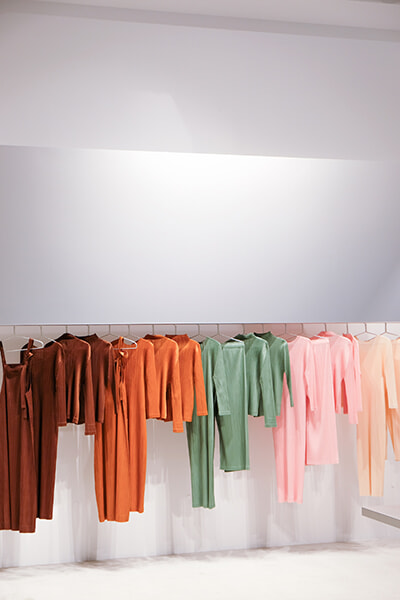 PLEATS PLEASE ISSEY MIYAKE、BAO BAO ISSEY MIYAKE、GOOD GOODS ISSEY MIYAKEなどが紹介されている1階。時間帯で変化する外光を受けてアルミニウムの面が繊細な表情を見せる。心地よい空間で色鮮やかな衣服を目にできる幸せ。