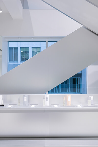 ―― 今回の空間に関して吉岡さんが書かれたコンセプトに「未来的なイメージを表現したこの空間は、イッセイ ミヤケの革新的な服づくりとフィロソフィーを表わしている」とありました。浮遊するようなアルミニウムウォールの躍動的な軽やかさに目を奪われ、ガラスごしに差し込む自然光を受けて表情を変えていくアルミニウムの美しさにも魅了されてしまいます。