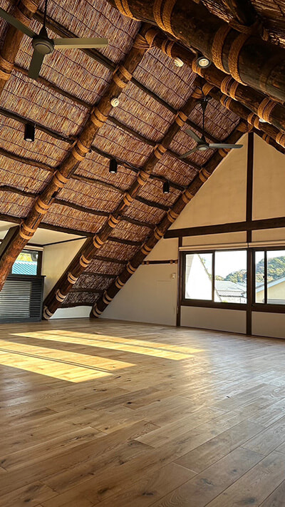3階は合掌造りの屋根を活かした空間で、ヨガが体験できる。湘南ビーチヨガとコラボしたプログラムを平日午前中は毎日開催している。