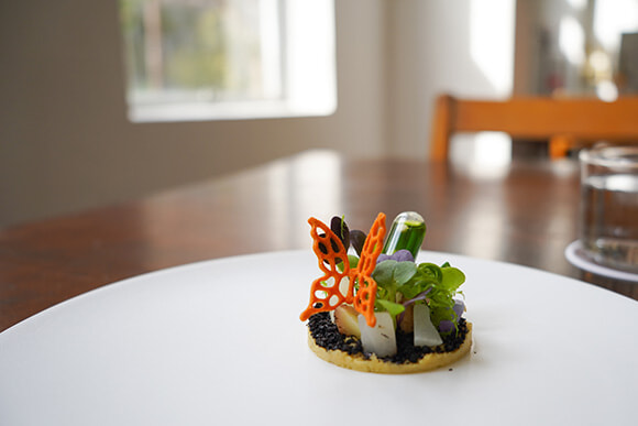料理は、フレンチ、イタリアン、和食などジャンルにとらわれないイノベーティブフュージョン。蔵元ならではの酒粕などの発酵食材を使った料理が特徴だ。また、お店の敷地内にあるハーブガーデンでは50〜60種類ほどのハーブを育てており、それをさまざまな料理に活用しているのだそう。