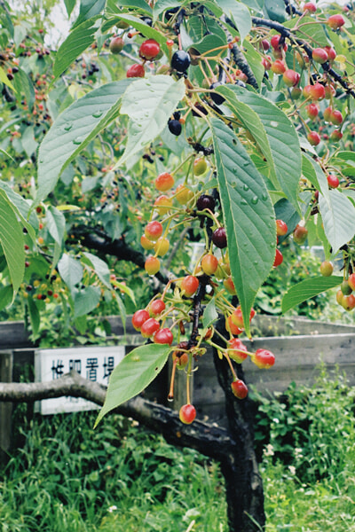 5月になるとサクランボが色付く。奥に堆肥置場が見える。黒々とした健康そうな土が置かれている。