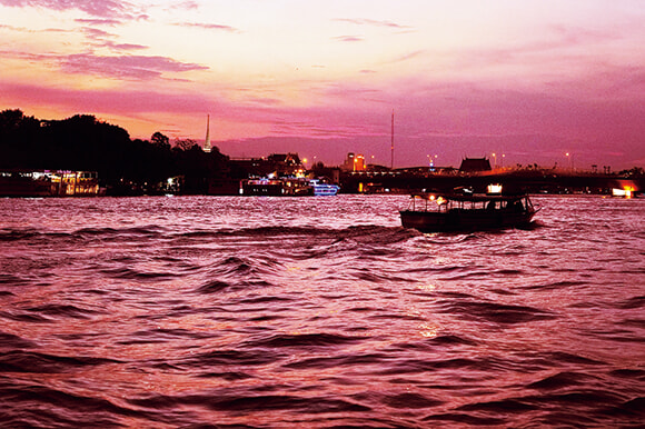 チャオプラヤー川は常に表情を変える。この日は水量も多く、美しい夕日に照らされていた。川沿いにはレストランやカフェがあり、地元の人たちにも人気。