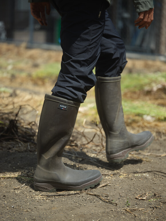 冨永さんが農作業で愛用しているエーグルのラバーブーツ「パルクール®」。天然ゴム製で素材が柔らかいので、パンツをインするのも楽だそう。