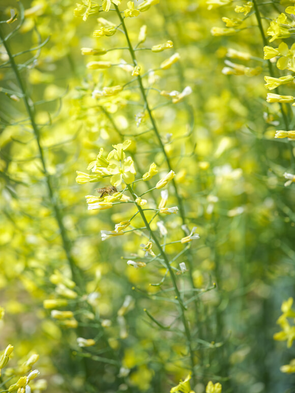 菜の花にやってくるミツバチ。畑では養蜂も行っていて、日本ミツバチから採れる貴重な生ハチミツを作っている。