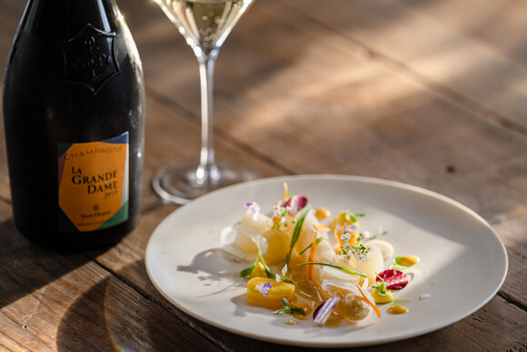 ラ・グランダムは、「グラン・クリュのブドウには “グラン・クリュ”の野菜を」というマダム・クリコの信念のもと、「ガーデン・ガストロノミー」というガストロノミー体験を提唱。これは、世界中のシェフたちとパートナーシップを組み、ガーデンで採れた野菜やハーブを駆使し、彼らのクリエイティビティとクラフトマンシップによって、究極の食体験を提供するというもの。そんなマダム・クリコの信念と、季節とともに変わる自然や畑を通し、あくなき料理への探究を続ける小林シェフと出会い実現した今回のフードペアリングでは、自然の恵みを贅沢に使用した料理の数々とともに特別なガーデン・ガストロノミー体験を楽しめる。