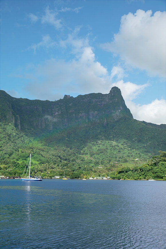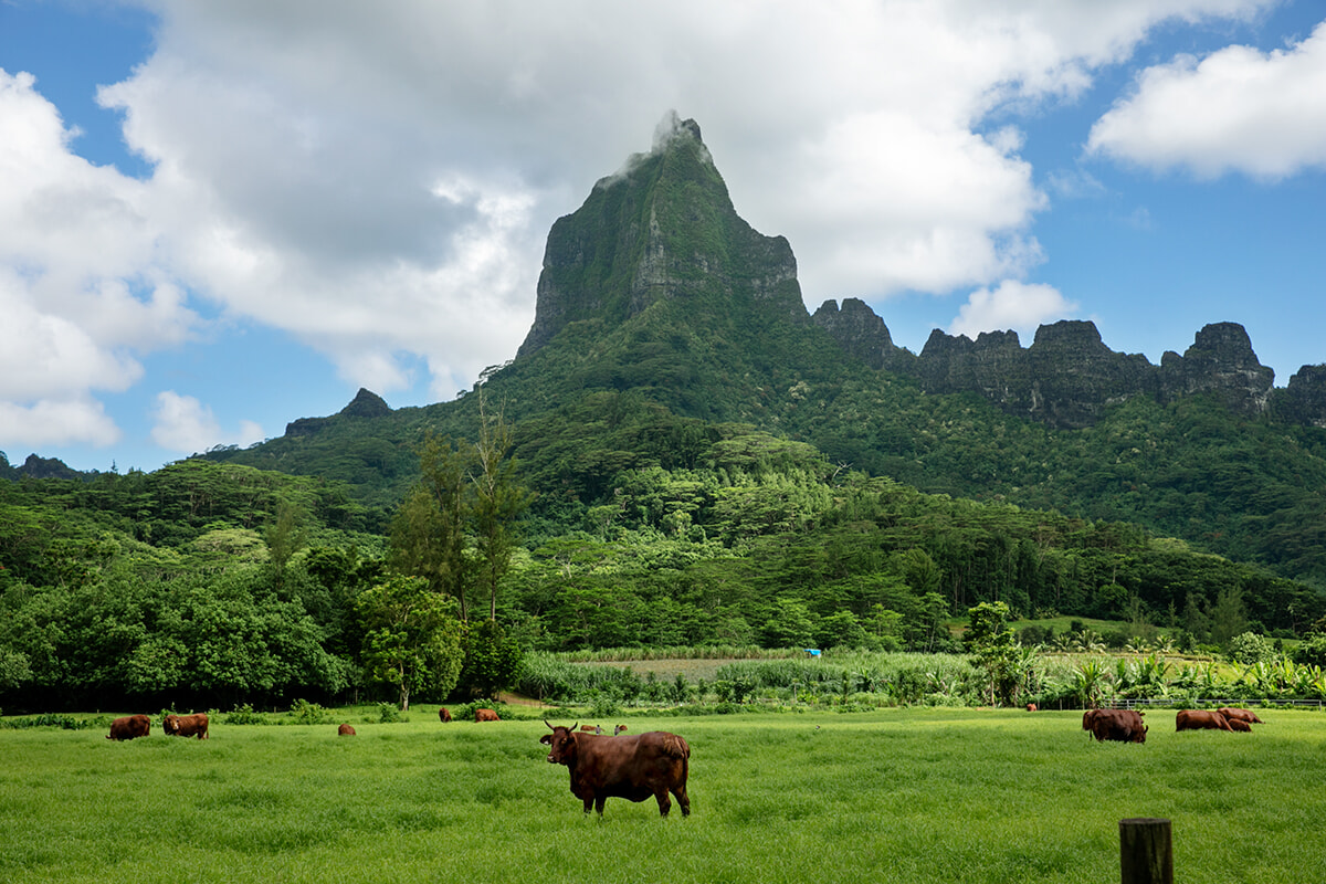 上空からハートの形に見えるモーレア島は、到着すると切り立つ雄大な山々と緑の濃さに圧倒される。入り組んだ湾は海とは思えぬ静けさで、緑を映し込む。ベルヴェデール展望台から見えるのは、右手にクック湾、左にオプノフ湾、その間にそびえるロツイ山という緑と青のコントラスト。