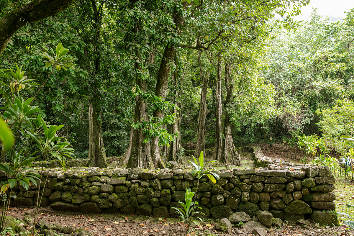 パイナップル畑を抜けて、ベルヴェデール展望台へ山道をドライブ。ティティロアのマラエはその近くに位置。鬱蒼と樹齢の高い木々が生い茂り、神聖な雰囲気。