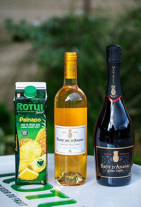 左から、毎年11月~4月にモーレア島で収穫されるパイナップルのみで作る100%ピュアジュース「Painapo」は数量限定で500CFP。ワインは甘さのないドライな飲み口で、香りがふくよか。ビオのパイナップルワイン3,500CFPと、シャンパン製法のスパークリングワイン5,650CFP