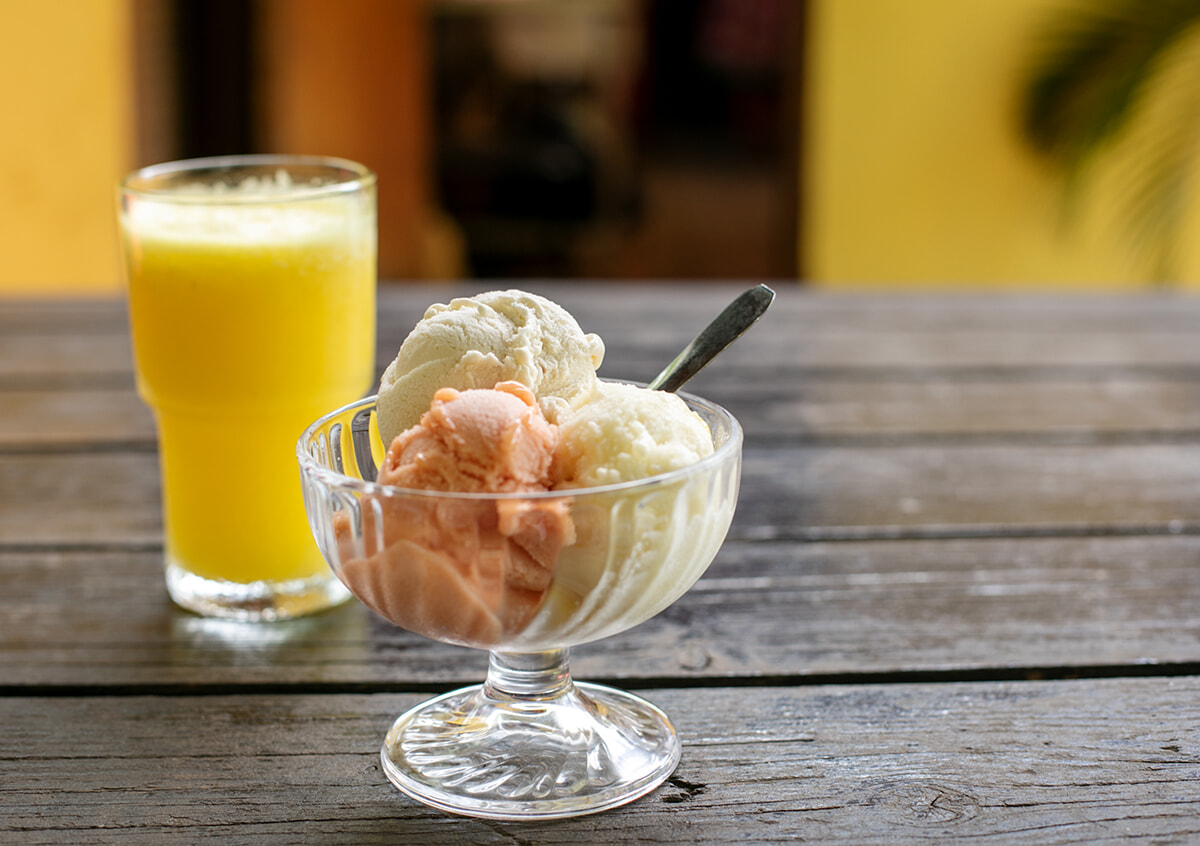 左は搾りたてのパイナップルジュース505CFP、右のアイスクリームは、上から時計回りに、バナナ、パイン、グアバ。3クープで600CFP