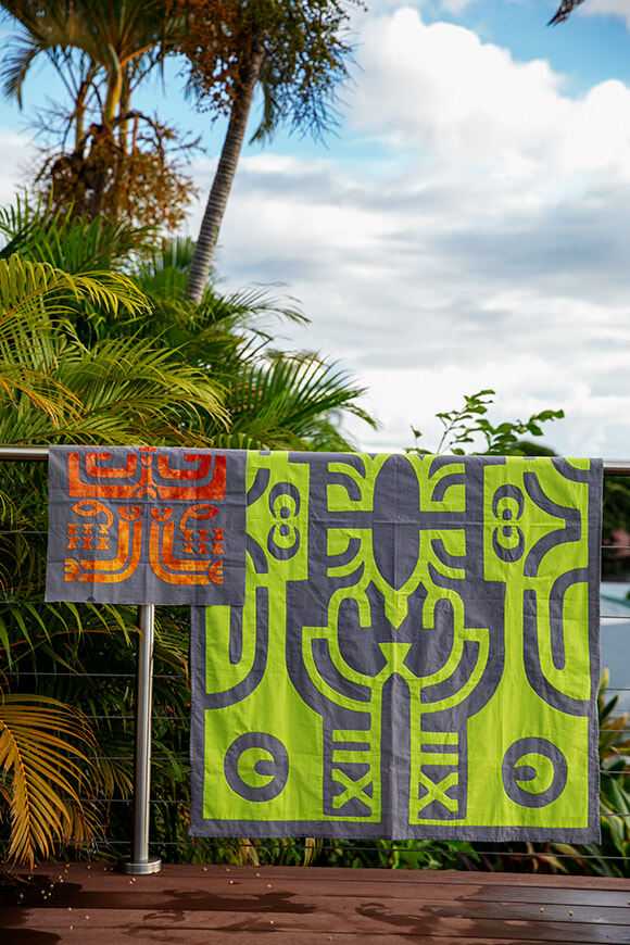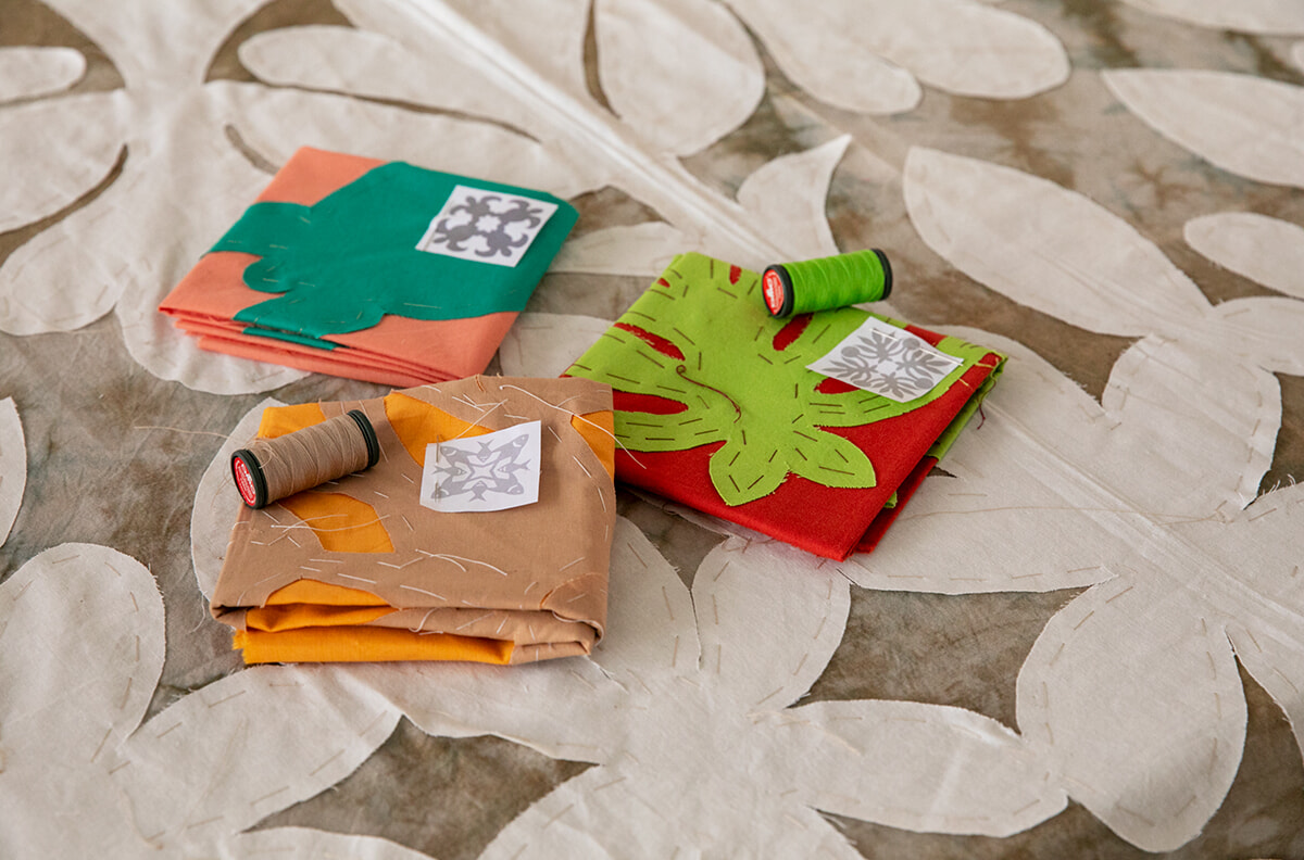 綿は詰めないタヒチ伝統のキルト、ティファイファイ。幼い頃からダンスコスチュームの制作で裁縫が身近だったラヴァは、ハワイでキルト教室、ニューヨークでファッションスクールに通い、自己流でティファイファイを作り始めた。モーレアの自宅でワークショップを開く一方、型紙と布、糸のキットを販売し、オンラインで作り方を公開。古典的な植物モチーフのモダンなアレンジや、タトゥーアーティストの夫に教わった図案も斬新だ。