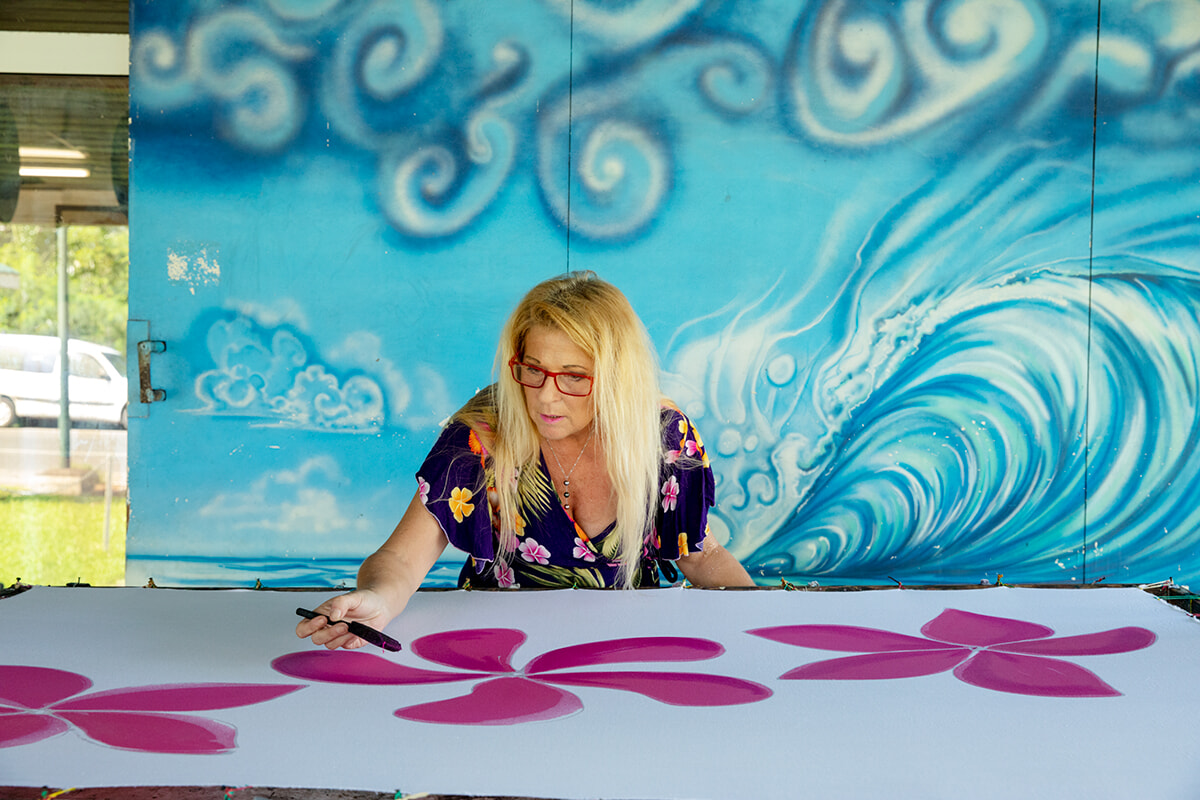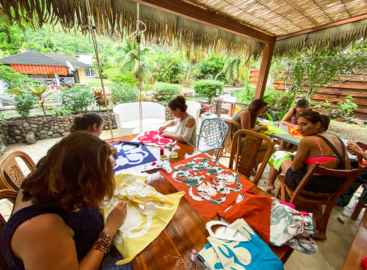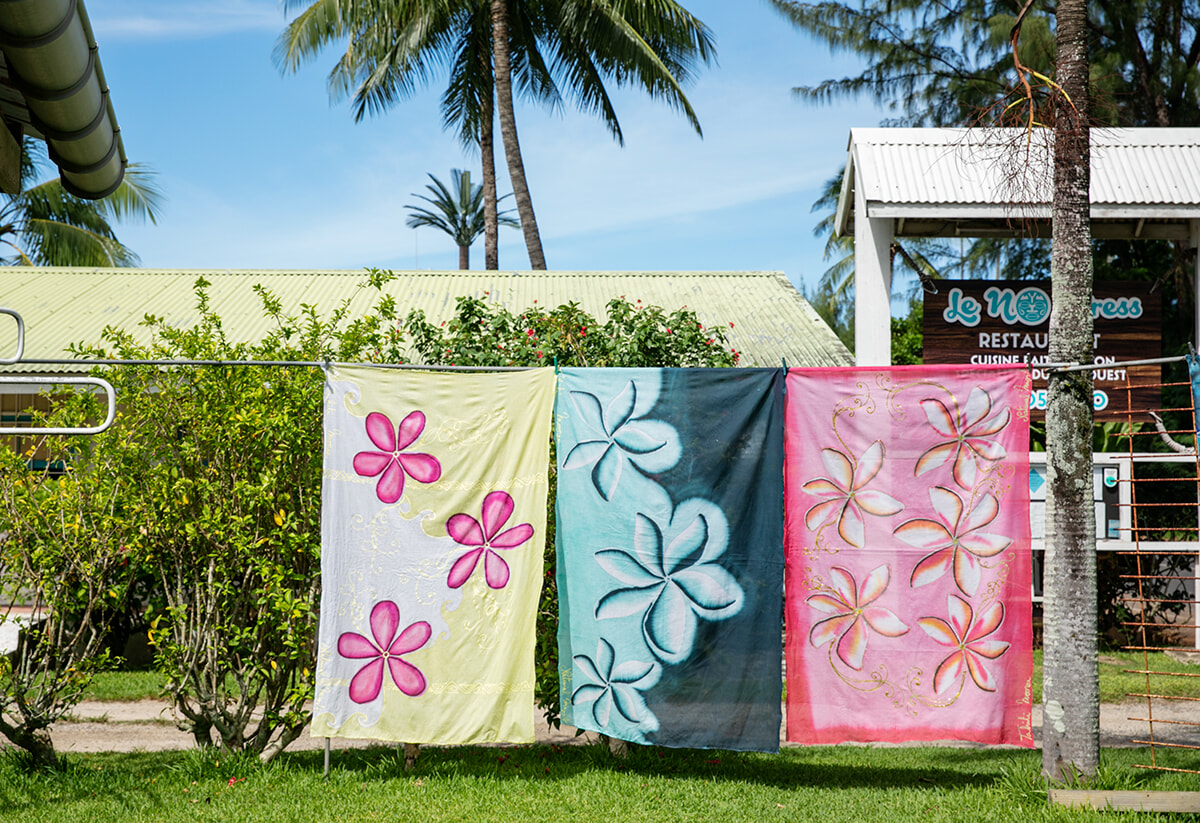 南仏でエステティシャンだったナタリー。アーティストの夫と、ハネムーンで訪れたモーレア島に移住し、好きだった絵を描くことをパレオ制作の仕事にしたという。上海から取り寄せるコットンに、天然素材の染料で描くパレオは、色使いもタヒチの動植物をモチーフにしたデザインも独創的。事前にオーダーすればオリジナルデザインで制作してくれる。